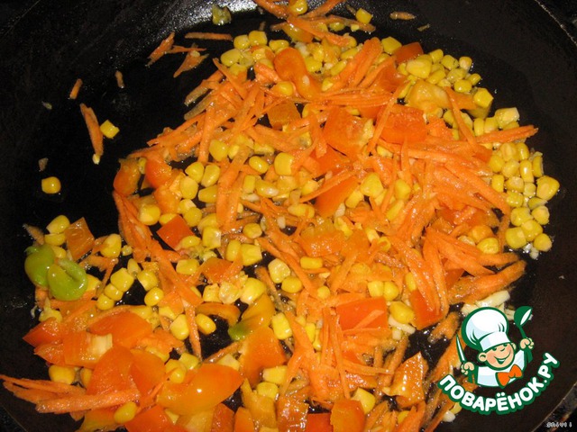 Добавить нарезанный кубиками красный перец ( у меня был желтый), зерна кукурузы ( я брала консервированную) и натертую на крупной терке морковь.Жарить примерно 5 минут, пока перец не станет мягким.