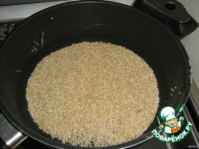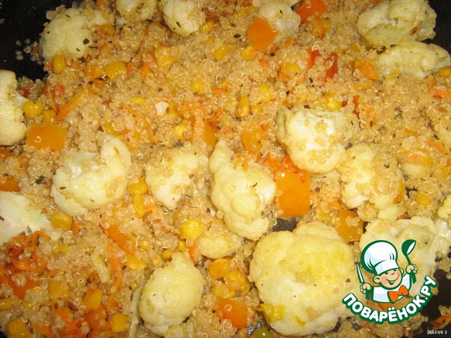 Добавить в сковороду киноа и готовую цветную капусту. (кстати, в оригинальном рецепте цветной капусты нет - мне так захотелось)Слегка перемешать.