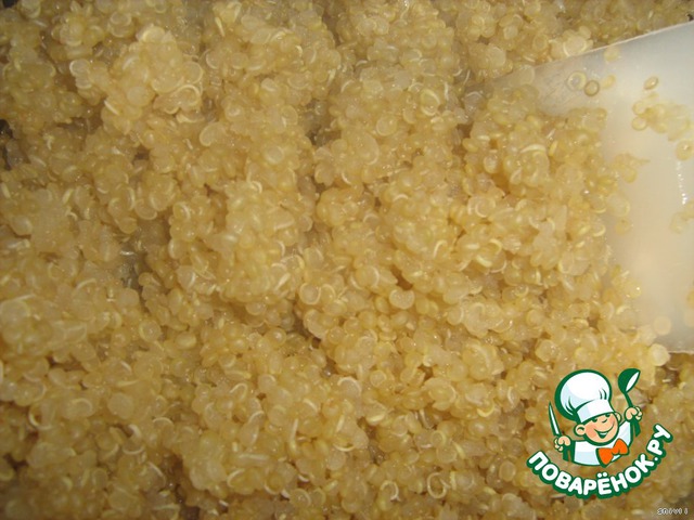 Киноа тщательно промыть в нескольких водах, чтобы ушла горечь. Поместить в кастрюлю, залить водой, слегка посолить. Довести до кипения, убавить огонь и варить до готовности 15-20 минут. Слить воду, отложить.