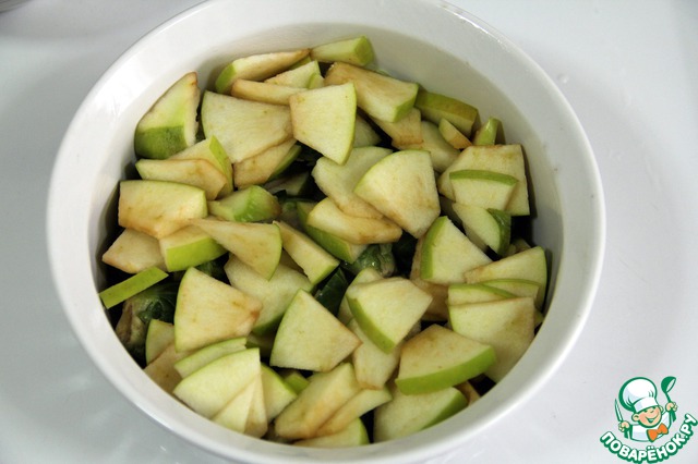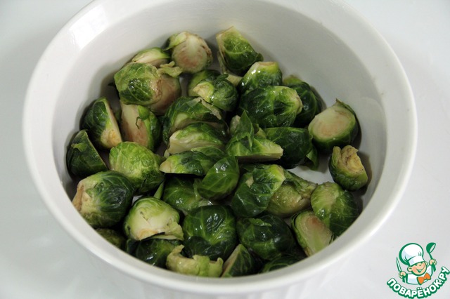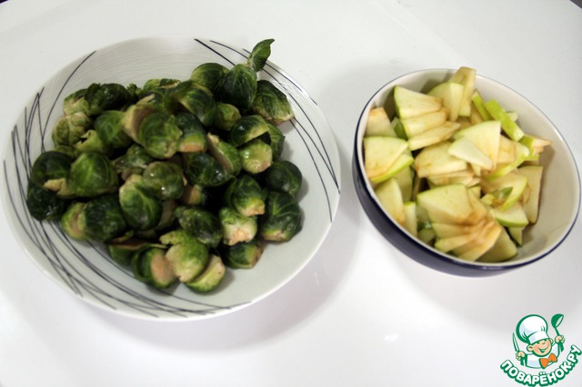 Кочанчики брюссельской капусты моем и режем пополам. Яблоко нарезаем на небольшие ломтики.