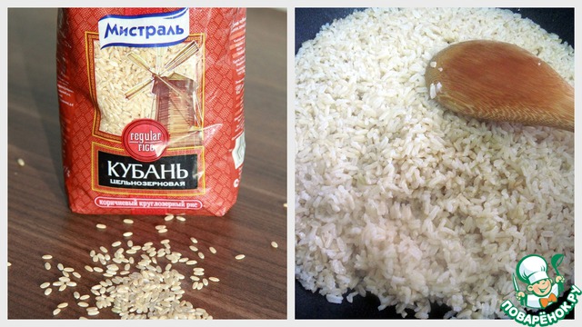 Сначала готовим рис. Его можно приготовить заранее и держать в холодильнике. Для этого рис (я использовала коричневый рис фирмы "Мистраль") промываем в холодной воде, даем воде стечь и кладем в глубокую сковороду. Хорошо смешиваем рис с растительным маслом. Затем добавляем соль (по вкусу) и воду в соотношении 1:2 (на стакан риса берем 2 стакана воды). Закрываем крышкой и варим на медленном огне до полного испарения воды.