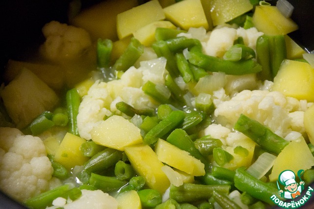 Добавить овощи, мультистакан воды, посолить и переключить в режим Тушение (40 минут).