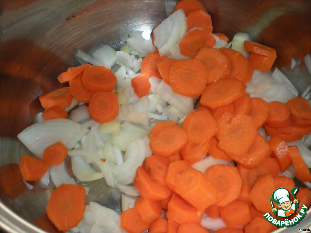 нарезаем лук и морковь, закидываем в кипящую воду (ее много наливать не надо, овощи потом начнут отдавать сок, а если вдруг окажется мало, то лучше добавить по ходу :) )