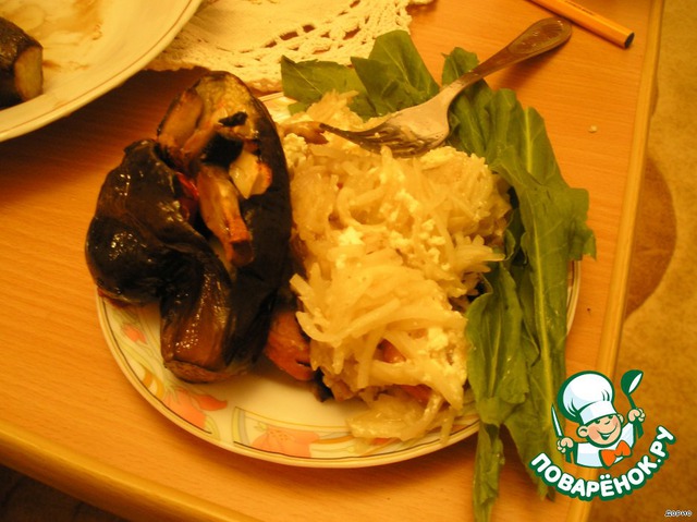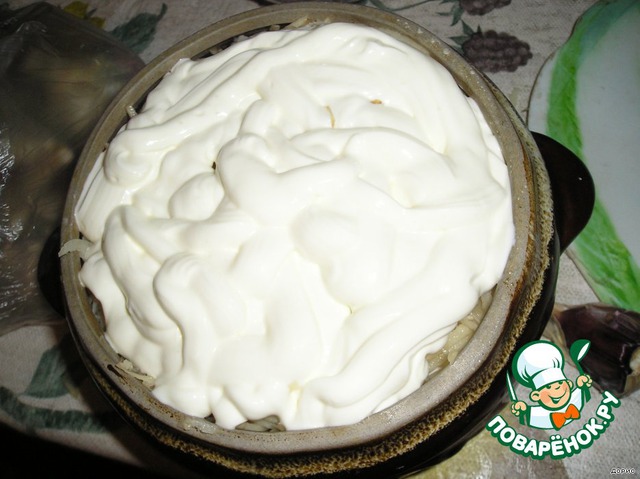 Обильно поливаем сметанкой. Если есть, присыпаем тёртым сырком. И - в микроволновку на 15 мин. Мощность - 800. Можно воспользоваться и духовкой, но будет в 2 раза дольше.