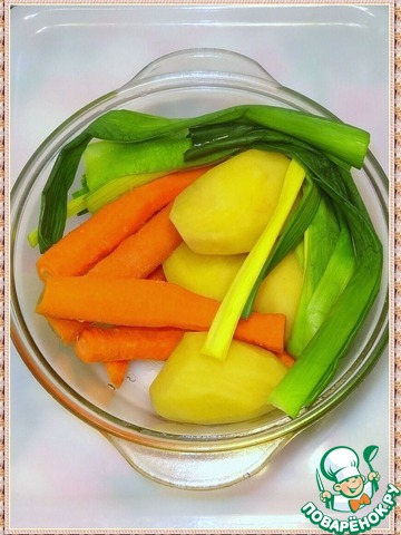 Обварите лук-порей слегка, морковь и картофель подольше в подсоленной воде.