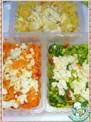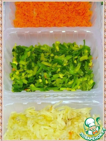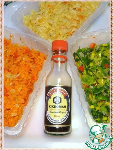 И разложите в 2 лоточка (морковь и картофель) поровну, а к луку-порею только 1 ст. л. Затем влейте по 1 ст. л. соевого соуса в каждый лоток.