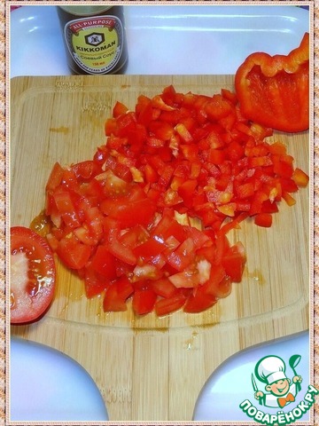 Порежьте мелкими кусочками сладкий перец и помидоры, обжарьте на сковороде, добавьте приправу, 1 ст. л. соевого соуса, подсолите и потушите 2 мин., затем разложите овощи по лоточкам, а к картофелю положите только 1 ст. л. смеси (чтобы не окрасить его в красный цвет).