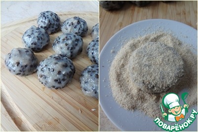 Если мы хотим курино-чечевичные котлетки, то добавляем чечевицы вдвое больше. Формируем сначала фрикадельки, потом панируем их в сухарях, сплющивая с двух сторон.