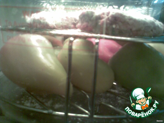 перцы нафаршировать начинкой. У меня осталась начинка, я сформировала котлетки, обваляв в муке. Поставить готовиться в аэрогриль, на нижнюю решетку - перцы, на верхнюю - котлеты при Т - 175 гр, на 30 мин