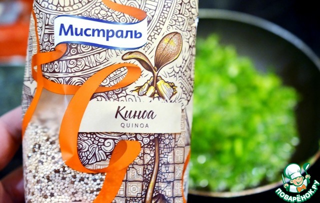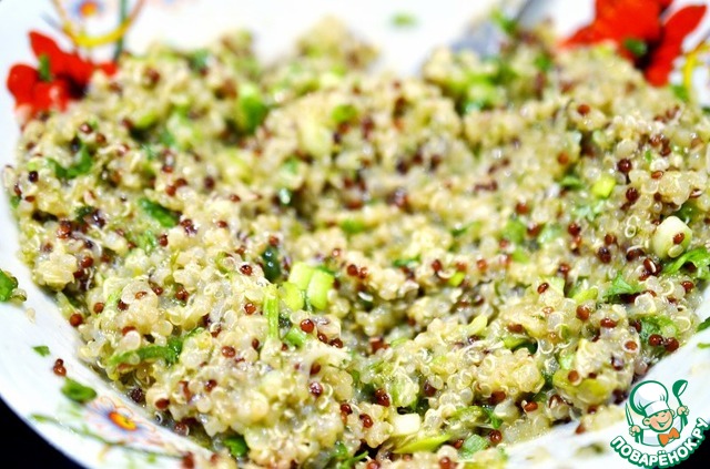 В сотейнике на 50 мл оливкового масла обжарить киноа и 2/3 зелени. Влить в сотейник воду, чтобы она покрыла киноа на 1,5 см, добавить соль, довести до кипения. Варить до готовности. Дать остыть при комнатной температуре.