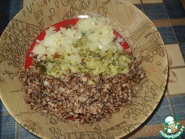 Лук режем мелкими кубиками и обжариваем на растительном масле. Солёные огурцы трём на тёрке, слегка отжимаем сок. Гречку смешиваем с жареным луком и огурцами.