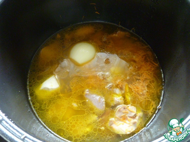 Влить 0.5 л воды, добавить целую очищенную луковицу и очищенный пастернак и включить Мультиповар, 100 градусов, 45-55 минут ( зависит от жесткости мяса).