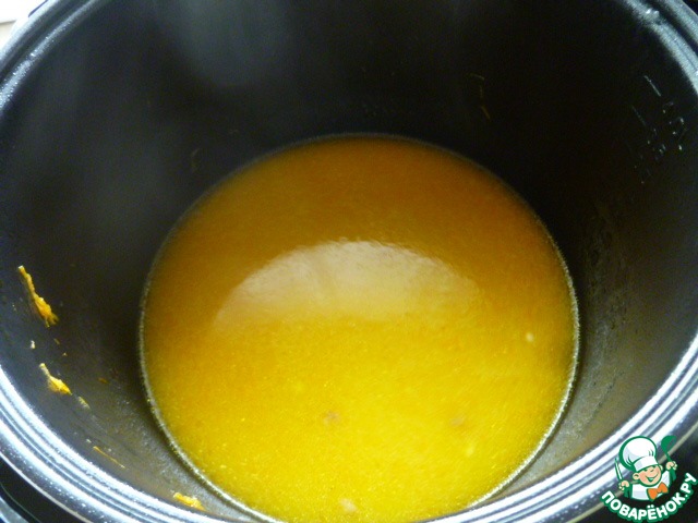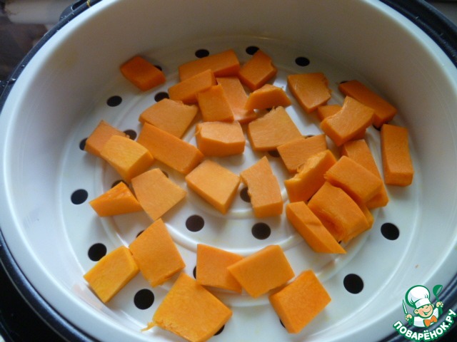 Сверху ставим чашу пароварки и выкладываем в нее порезанную на кусочки тыкву.