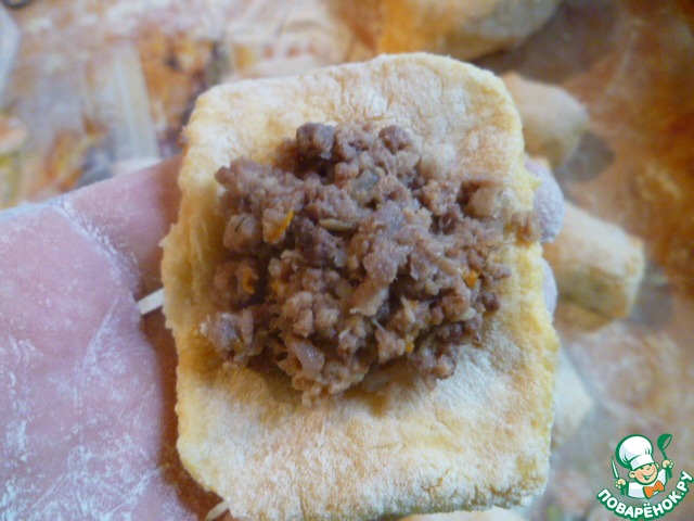 Каждый кусочек теста расплющиваем в лепешку, выкладываем немного мяса.