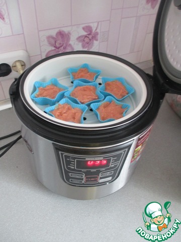 Выложить в силиконовые формочки. В чашу мультиварки залить 1 литр воды. Поставить контейнер. Программа "Варка на пару" 30 мин