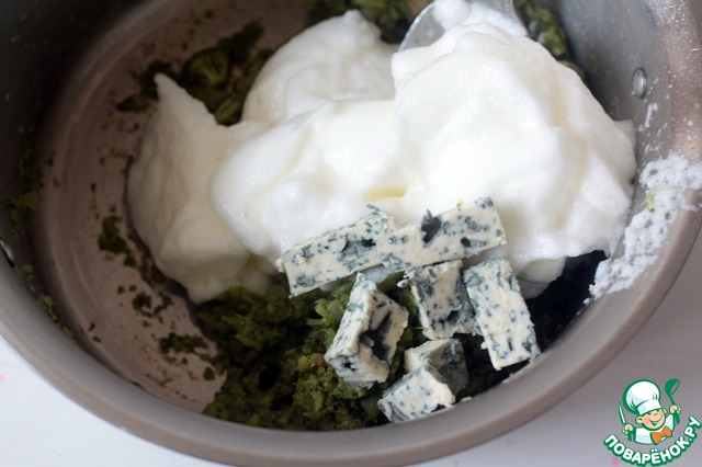 Сыр с плесенью нарежьте кубиками, овощи слейте и и сделайте пюре при помощи блендера. Добавьте белок и аккуратно перемешайте.