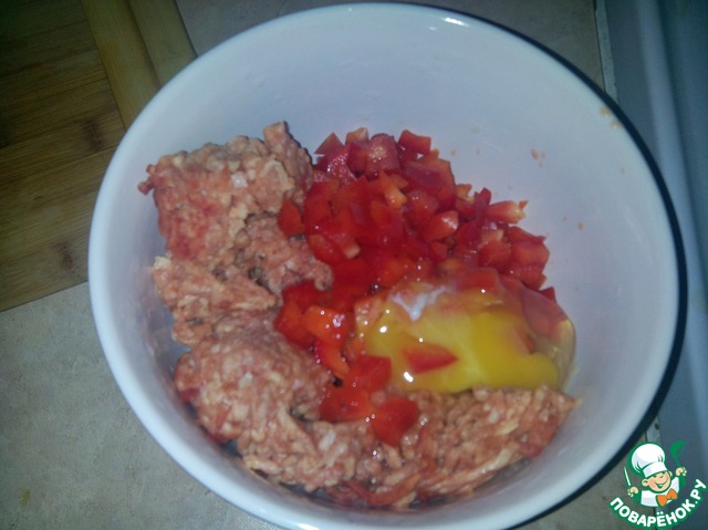 Фарш выкладываем в глубокую миску. Слегка солим. Кусочки сладкого перца отправляем в фарш, добавляем яйцо и лук, я лук через терку пропускаю, у меня не любят даже вид лука, а так я их обманываю)))
