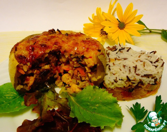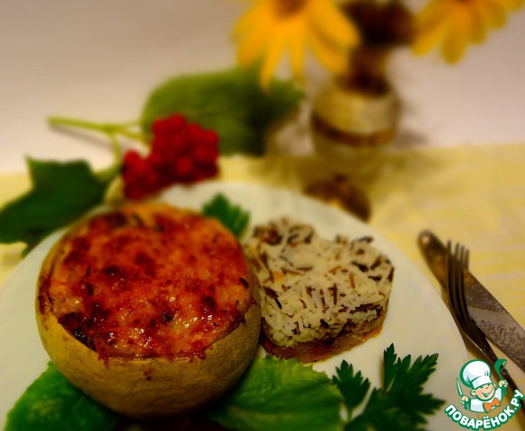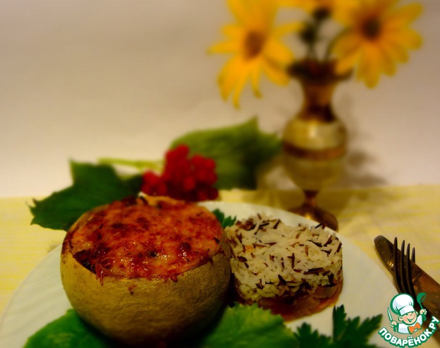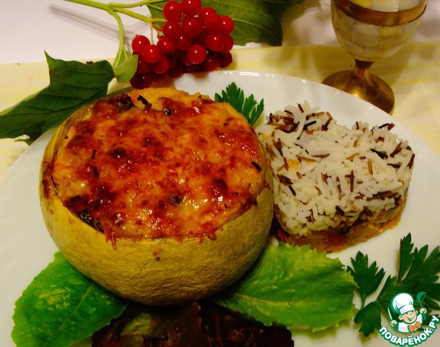 У тыквы срезать крышечку и освободить серединку с помощью специального приспособления - нуазетки или обыкновенной ложки, стараясь не проткнуть кожицу. Заполнить тыкву обжаренными овощами, мясом и рисом.