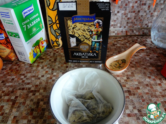 Для рецепта нужно брать белый, длиннозёрный рис, но мы возьмём рис "Акватика", ТМ "Мистраль", в котором перемешаны белый и дикий рис. Он гораздо полезнее, да и выглядит эффектно.