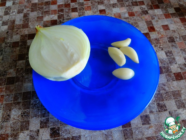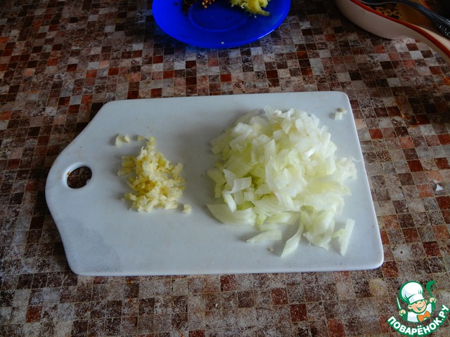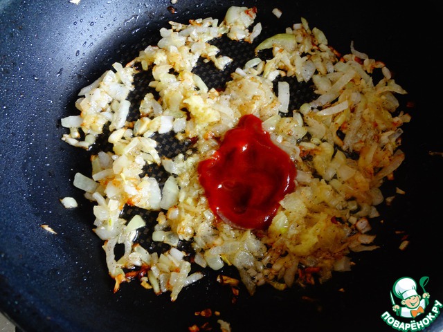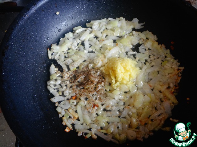 Разогреть в сковороде растительное масло (лучше рапсовое), и пожарить сначала лук, потом добавить к нему чеснок, имбирь и специи.