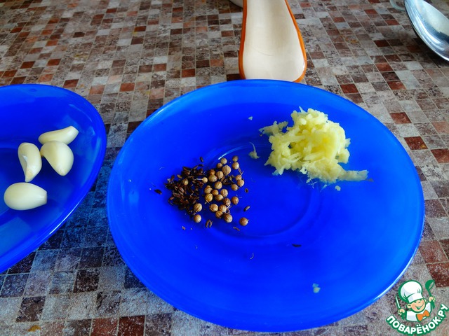 Приготовить тмин и кориандр. Их нужно размолоть и просеять через сито. Имбирный корень натереть на мелкой тёрке.