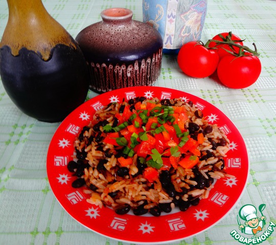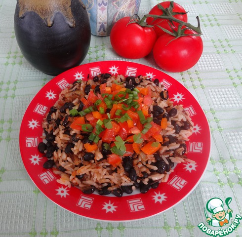 Выкладываем нашу Галло Пинто на тарелку. Украшаем сверху мелко нарезанными помидорками черри и болгарским перцем. Присыпаем также измельчённым зелёным луком и петрушкой.