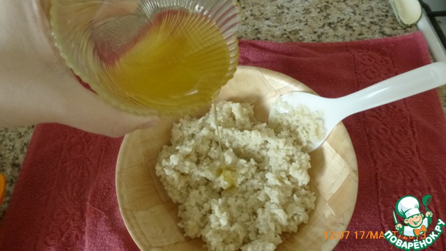 После того, как наш рис будет готов, добавляем мед, хорошо перемешиваем, выкладываем орехи, изюм и цукаты.