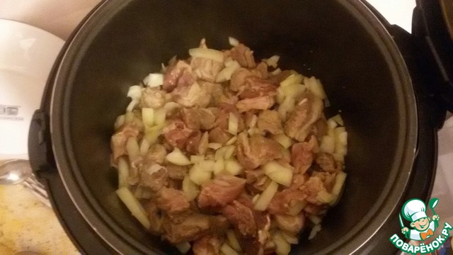 Моем и нарезаем свинину на кусочки (примерно 2*3), основной жир я все таки убирала. Лук чистим и режем достаточно крупно. Половинку луковицы резала на 4 части вдоль, а после поперек, обычной толщиной. Кладем оба ингредиента в мультиварку, солим и выбираем режим жарка - 15 минут. Обращаю внимание, что я не добавляла масла! Во время жарки пару раз перемешивала. Лук дает сок и свинина выделяет воду, поэтому мясо не прилипнет к дну.