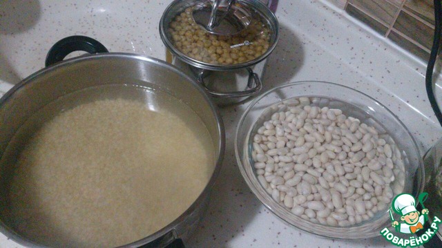 Фасоль, пшеницу и нут замачиваем на ночь в теплой воде, все в отдельной посуде