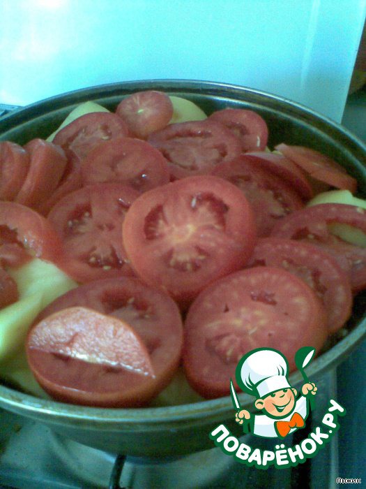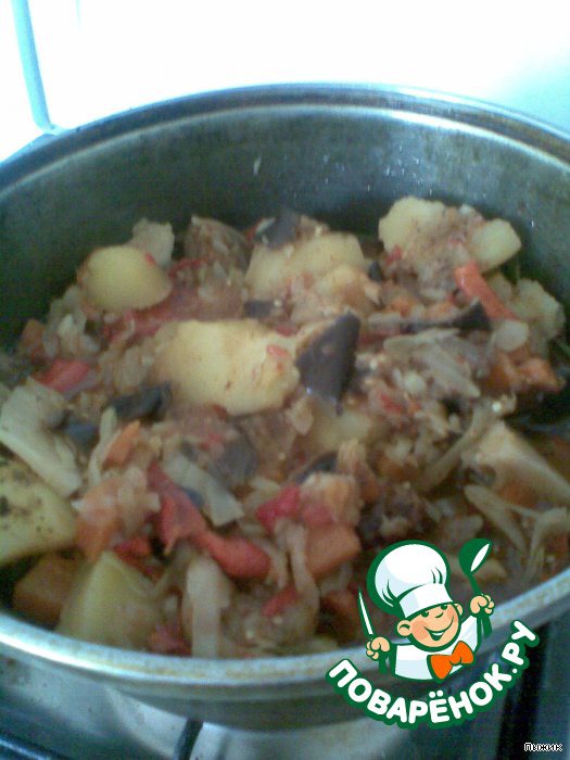 В большой казан налить растительное масло, пока оно нагревается, мясо порезать на кусочки, закинуть в казан, потушить минут 20. За это время порезать лук полукольцами или кольцами, морковь кубиками. Положить на мясо, присолить. Сверху слой порезанных крупно баклажанов, чуть присолить. Дальше слой перца. Сверху капуста, нашинкованная крупно. Соль. Затем слой крупно порезанного картофеля, присолить. Последний слой - помидоры, порезанные кружками. Чуть посолить, поперчить. Закрыть крышку казанка и тушить в течение часа.