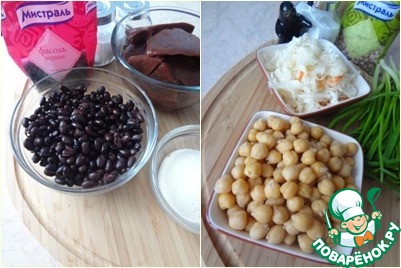 Я указала вес бобовых в отварном виде. В сухом примерно вдвое меньше. Но для этого рецепта и не нужно вымерять количество ингредиентов с точностью до грамма. Фасоль и нут замочить в холодной воде с вечера. Утром отварить. Фасоль у меня черная ТМ Мистраль и нут тоже ТМ Мистраль.