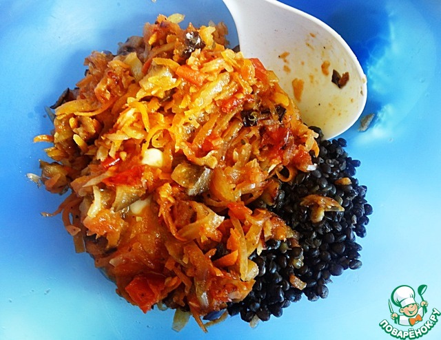 Смешать с чечевицей, посолить и поперчить по вкусу. Размешать.