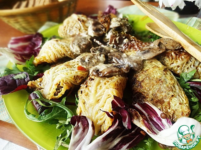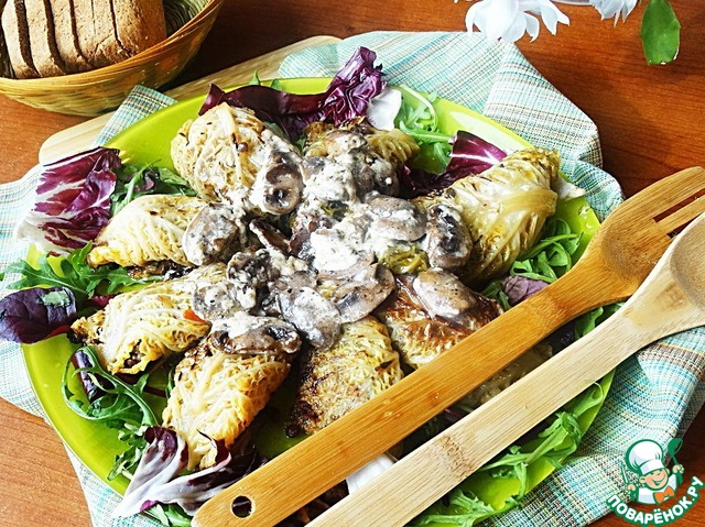 Сервировать на зелёный салат. Украсить голубцы обжаренными в сливках шампиньонами. Если будете кушать в Пост, то сливки придётся исключить или заменить кокосовым молоком.