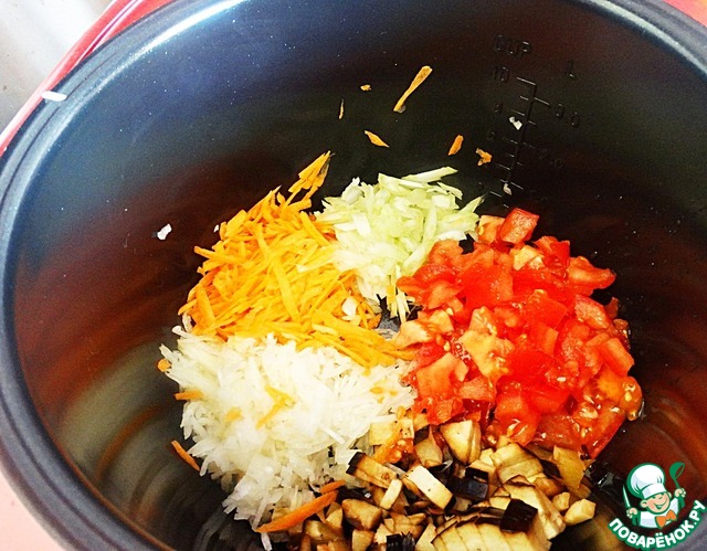 Залить горячим бульоном и тушить при закрытой крышкой, задав программу "Тушение" 50 мин.