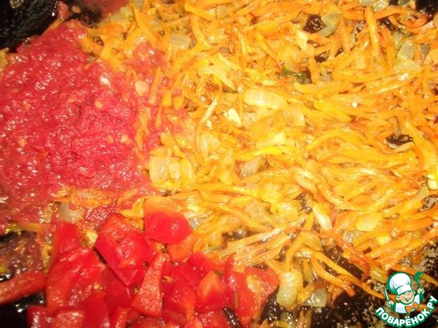 Морковь натереть на крупной тёрке, лук мелко порезать, переложить всё в сковороду, добавить растительное масло, и обжарить до золотистого цвета. Болгарский перец порезать на кубики, помидор натереть на тёрке, добавить к моркови с луком, тушить в течении 5 минут.
