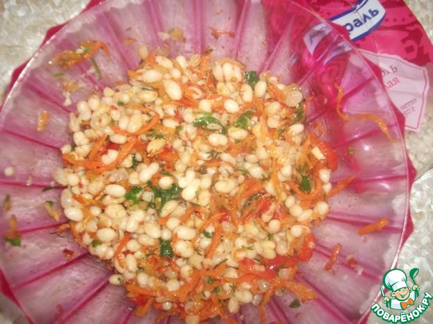 Чеснок измельчить, кинзу, укроп, петрушку порезать мелко, соединить с содержимым сковороды добавить соль и перец. Перемешать с фасолью.