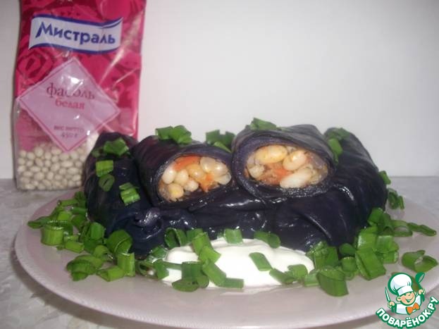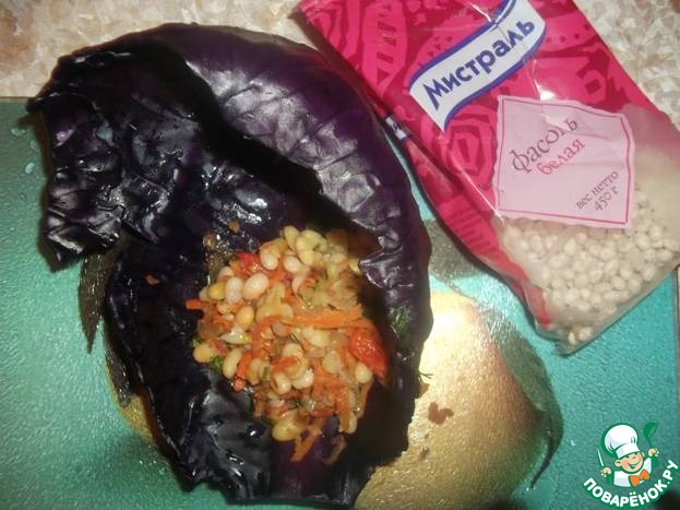 Капусту поместить в кастрюлю с кипящей водой на несколько минут, разделить на листья. Срезать с капустного листа твёрдую часть, положить внутрь начинку из фасоли, предварительно разделив начинку на 12 частей