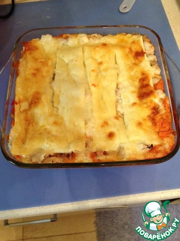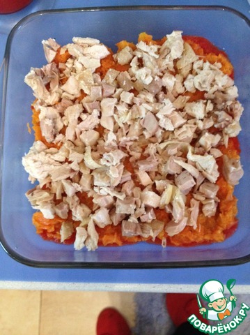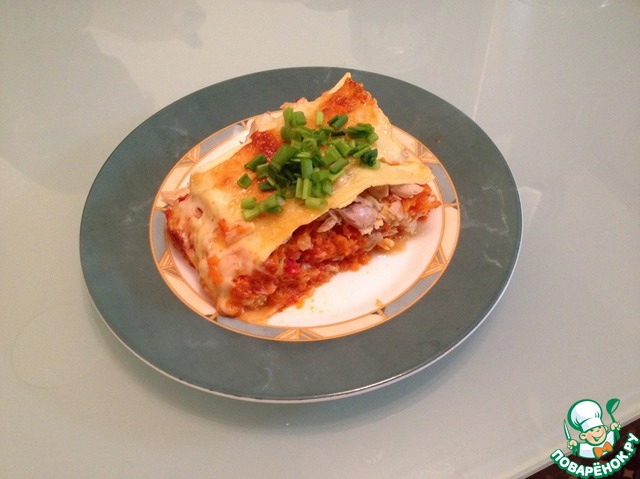 Собираем лазанью. Листы смазать 1\2 томатной пасты, далее выложить половину тыквы, половину куриного филе. Накрыть слой листами и повторить.