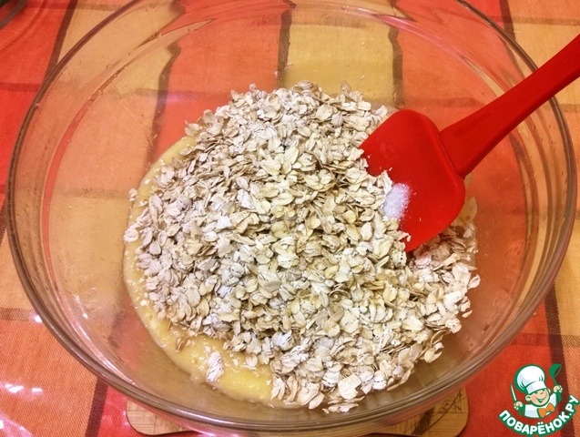 Затем кладем в тесто сахар, соль, хлопья, разрыхлитель.