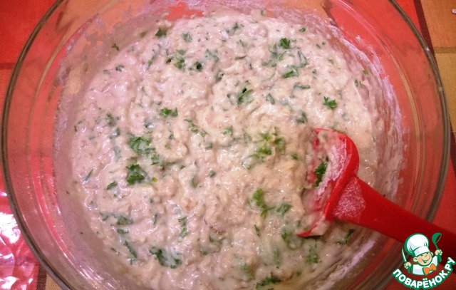 Всыпаем муку. И мелко нарубленную зелень. У меня была вот такая «кучерявая» петрушка. В принципе, можно использовать любую. С зеленым луком очень вкусно, с укропом.