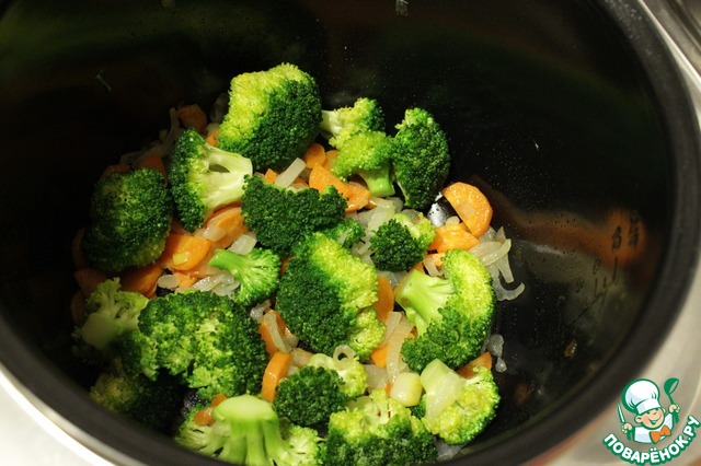 Лук нарезать четвертькольцами, морковку полукольцами, слегка спассеровать на масле в мультиварке с открытой крышкой в режиме жарка, добавить соцветия брокколи, перемешать, пассеровать 1 минуту.