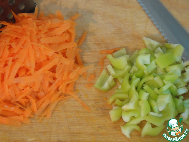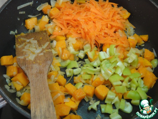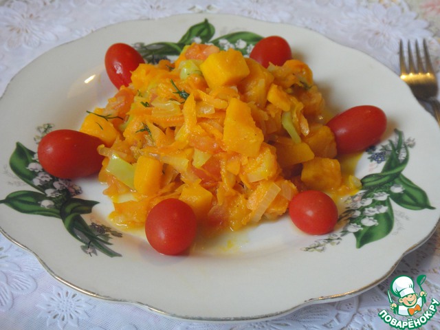 Добавить морковь и перец к тыкве, продолжать тушить. При необходимости добавить немого воды