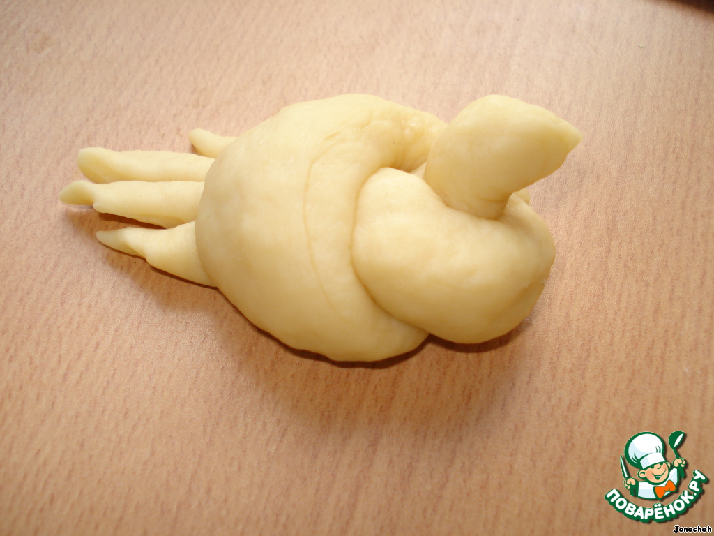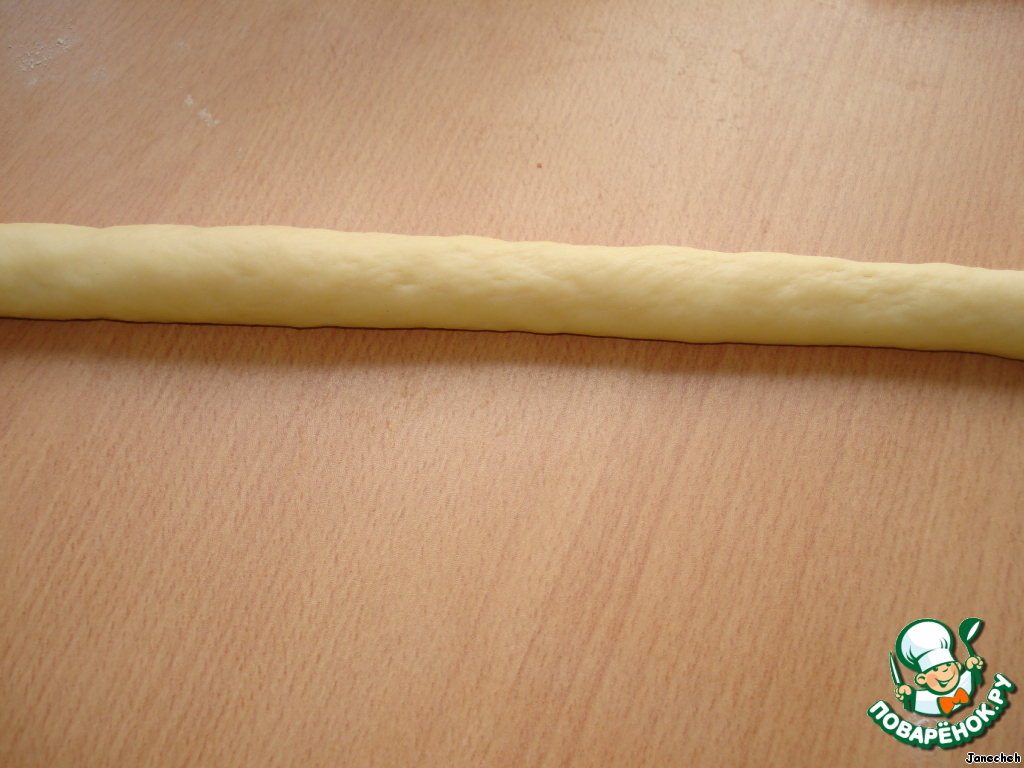 Из готового тесто скатала колбаску (толщиной с большой палец). Нарезала ее на не очень большие равные куски (не мельчите, нужен простор для сворачивания птичек в узелки). У меня получилось 6 жгутов.