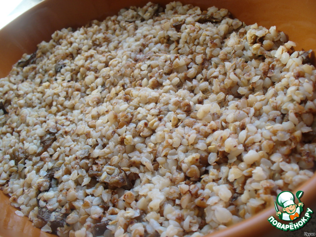 Готовую гречку смешиваем с половиной подготовленных грибов, если нужно, досаливаем и укладываем слоем в форму, слегка смазанную растительным маслом. Разравниваем.