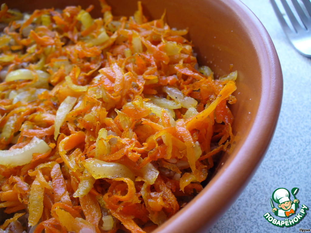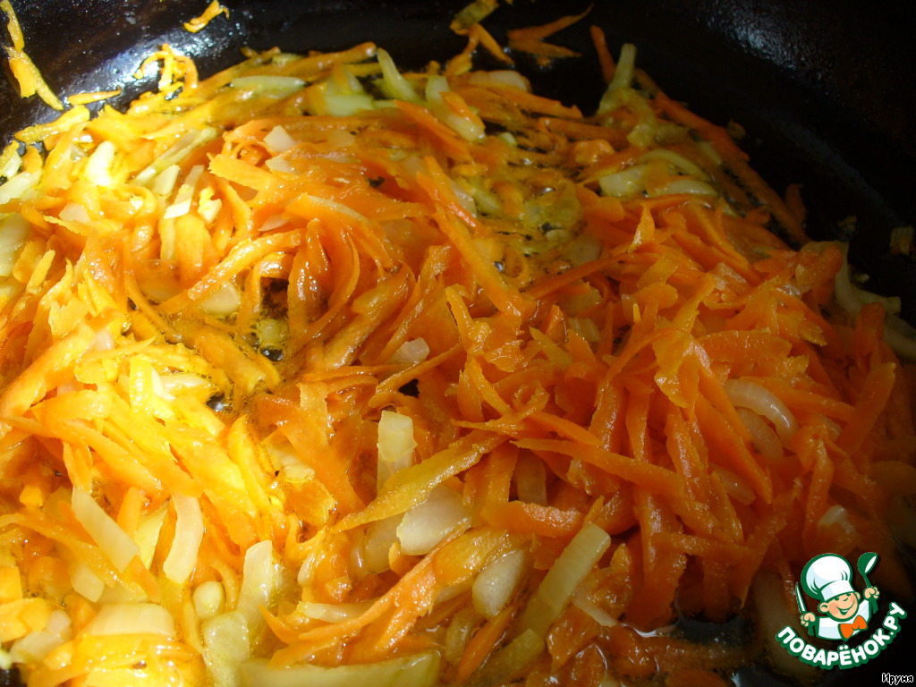 Лук режем четвертинками колец, морковь трем на крупной терке, обжариваем на растительном масле. Солим, перчим.