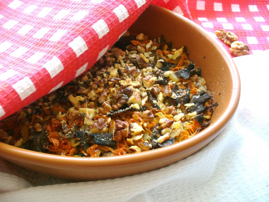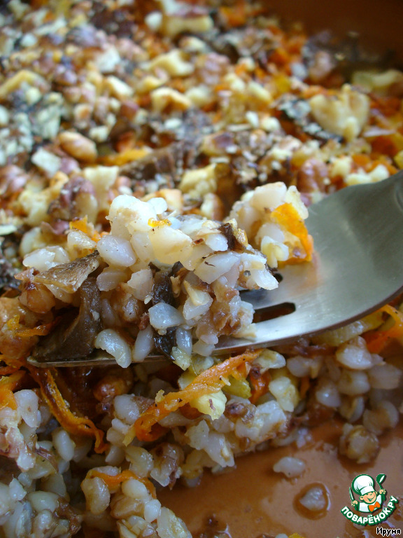 | Вкусное интересное блюдо из гречки с грибами и овощами. Может использоваться как самостоятельное блюдо, так и в качестве гарнира. Рецепт этого блюда был размещен на сайте в 2008 году пользователем karumniece под названием "Слоeнка из моркови и гречки" и иллюстрирован мной в рамках акции "Раскраски". |