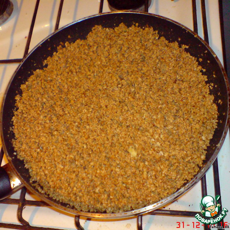 При постоянном помешивании обжариваем хлопья минут 10-15 до коричневатого оттенка (мои любят потемнее). Затем сковородку снимаем и даём хлопьям остыть.