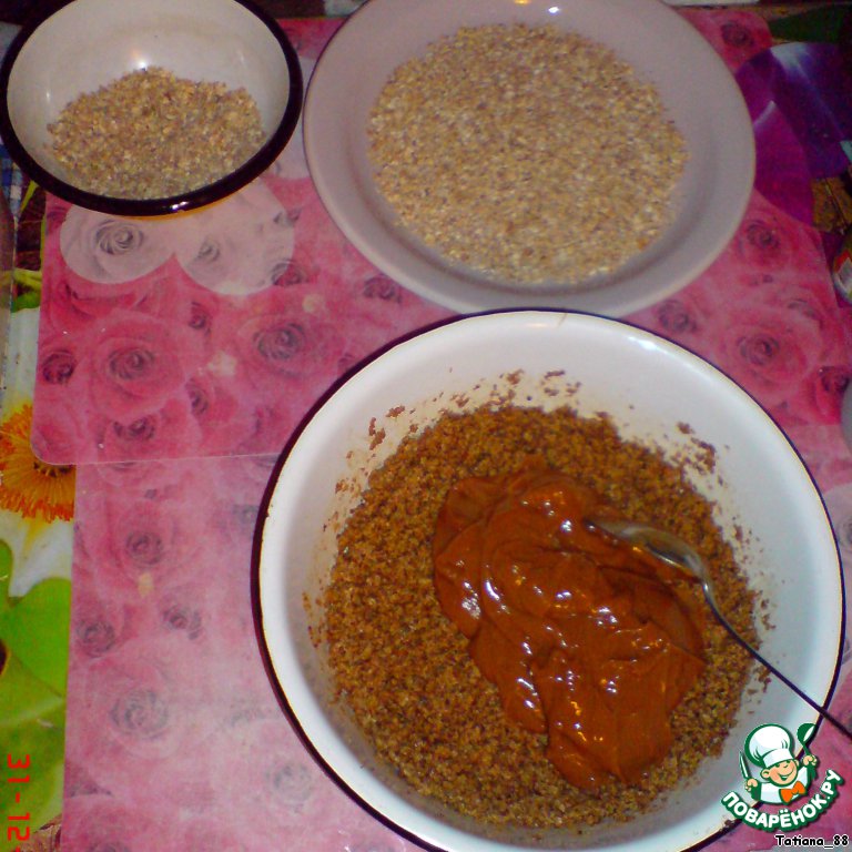 Обжаренные и уже остывшие хлопья перекладываем в большую миску и добавляем к ним сгущёнку. Тщательно всё перемешиваем. Если у кого-то смесь получится тёплой, то лучше её всё же охладить перед следующим этапом.