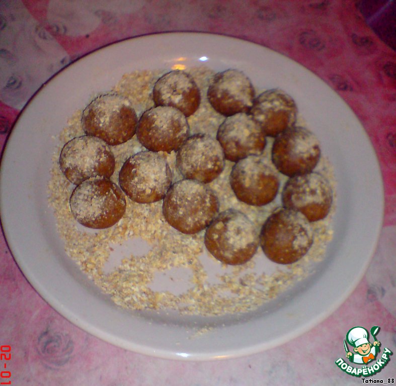 Теперь берём и катаем шарики размером с грецкий орех. Шарики обваливаем в кокосовой стружке или молотых орехах, или в подсушенных, слегка обжаренных (без масла) всё тех же овсяных хлопьях (в этот раз я так и сделала, а вообще в оригинале обсыпка кокосовая). Здесь как фантазия подскажет.