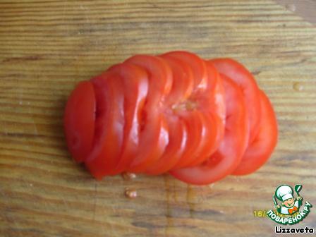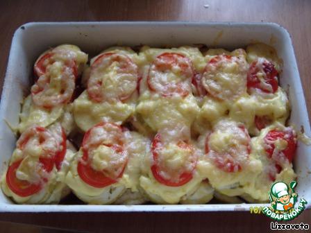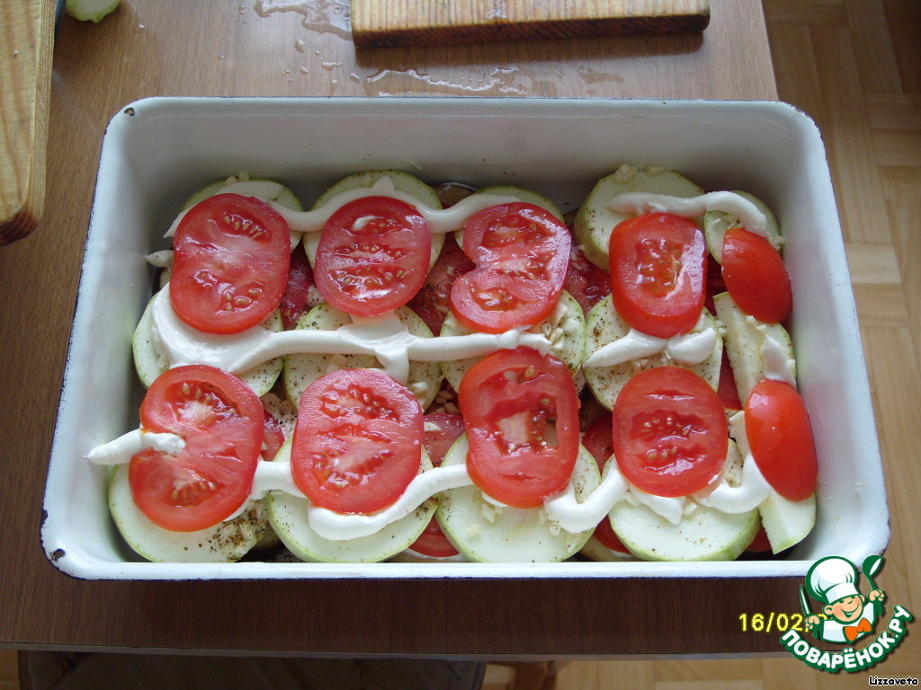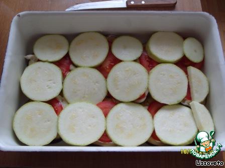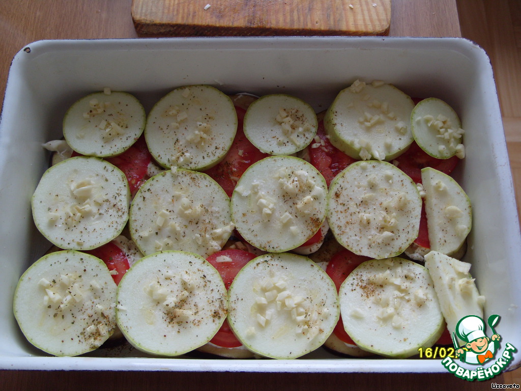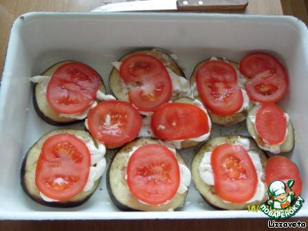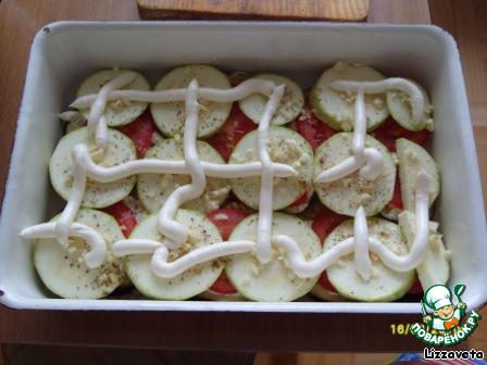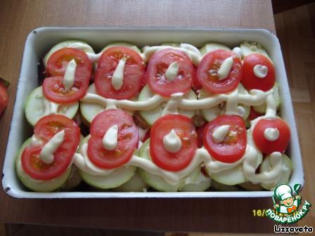 Затем слои повторяем: баклажан (соль, приправа) - чеснок - майонез - помидор - кабачок (соль, приправа) - чеснок - майонез - помидоры (последний слой). На каждый кружок помидора капнуть майонез и в духовку, разогретую до 200 градусов на 40 мин.